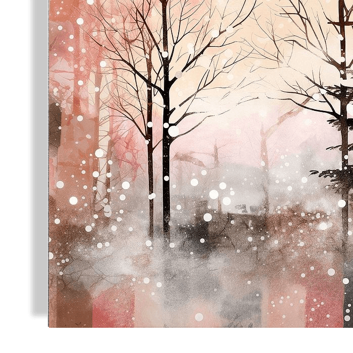 Een verstild winterlandschap, waarin de naaktheid van de bomen schril afsteekt tegen een zachte, roze getinte lucht. De bomen, met hun bladerloze takken, roepen een gevoel van kalmte en verstilling op. Sneeuwvlokken lijken te dwarrelen in de lucht, waardoor de scène een textuur van koude maar serene schoonheid krijgt. De silhouetten van…