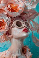 Portret van een vrouw gemaakt met paletmes en digitale kunst. Mooie zalmroze bloemen in het haar en een bleekroze zonnebril. Haar jurk is gemaakt in de zelfde kleurstelling. De achtergrond is verfrissend aquablauw, wat zorgt voor een mooi contrast en een zomers gevoel. Passend bij diverse stijlen en trends, waaronder bloemen, zomer, lente, modern abstract. Artist: Bianca ter Riet.