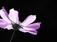 Tegenlicht foto van een roze Cosmea bloem in sterk contrast met de zwarte achtergrond.