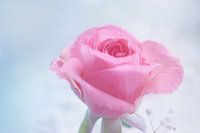 Een mooie bloeiende roze roos tegen een zacht blauwe achtergrond.