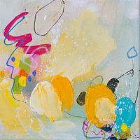 Een zonnig abstract schilderij met speelse kleurrijke elementen. Een zomers feestje voor je ogen dat uitnodigt om zelf bij te fantaseren.