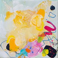 Een zonnig abstract schilderij met speelse kleurrijke elementen. Een zomers feestje voor je ogen dat uitnodigt om zelf bij te fantaseren.