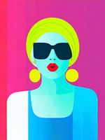 Abstracte afbeelding van een vrouw met zonnebril, gele tulband, blauwe kleding, rode lippen en gouden oorringen in haar oor.
