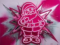 Pinkmas Santa – Neon Rebel Christmas is allesbehalve de klassieke kerstman. Dit kunstwerk geeft hem een edgy make-over: felroze neonlijnen, een vrolijke maar zelfverzekerde blik, en een achtergrond die explodeert in zilveren sterren, glinsterende verf en urban energie. Deze kerstman is niet braaf – hij is een statement.