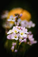 Close-up van een Pinksterbloem tegen de achtergrond van de "opkomende zon" van een Paardenbloem...