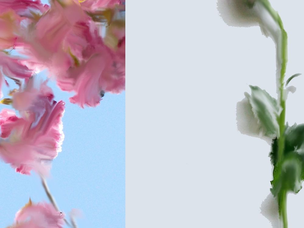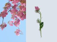 Abstract tweeluik, roze bloemen met zowel een blauwe als een witte achtergrond.