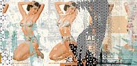 Vanuit het onderbewustzijn heb ik gespeeld met verschillende elementen en laat composities laag voor laag ontstaan. Alles komt samen in een collage waar ik de volledige controle heb over grootte, compositie en kleur. In de originele werken volgt hierna de fysieke bewerking,deze wordt opgebouwd met diverse materialen. De basis is digitaal maar de finishing touch is handwerk. De werken zijn een mix van illustratie, typografie, fotografie en verschillende compilatietechnieken. Ik vind inspiratie in vintage brochures, street-art, bloemen, reizen, film en kunst.