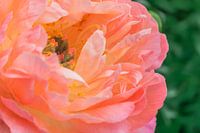De foto "Peony Coral Sunset" toont een close-up van een pioenroosbloem in intense koraal-, roze- en perzikkleuren. In het midden van de bloem zijn gele meeldraden en groene carpels met delicate roze uiteinden te zien. De compositie richt zich op de organische structuur en de verscheidenheid aan kleuren van de bloemblaadjes, die zich ontvouwen in zachte, overlappende lagen.