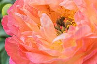 De foto "Peony Coral Sunset" toont een close-up van een pioenroosbloem in intense koraal-, roze- en perzikkleuren. In het midden van de bloem zijn gele meeldraden en groene carpels met delicate roze uiteinden te zien. De compositie richt zich op de organische structuur en de verscheidenheid aan kleuren van de bloemblaadjes, die zich ontvouwen in zachte, overlappende lagen.