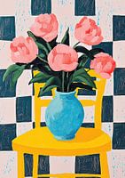 Een gouache schilderij van roze pioenrozen in een blauwe vaas op een gele stoel, met een geblokte achtergrond, minimalistische penseelstreken, gedurfde vormen en patronen en handgeschilderde details in roze, wit, zwart, blauw en groen.