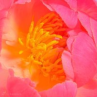 Close-up foto van het hart van een open gebloeide roze rode pioenroos. De gele stamper en meeldraden vormen het hart van de foto