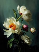 Een stralend boeket pioenrozen ontvouwt zich tegen een diep groenblauwe achtergrond, geschilderd met gedurfde, gestructureerde streken die zowel elegantie als emotie uitstralen. Elk bloemblaadje lijkt geheimen van de lente en stille veerkracht te fluisteren.