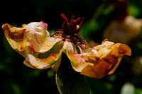 Zelfs wanneer de Pioenroos haar bladeren verliest en in verval raakt, ziet zij er nog majestueus uit met in de kern een prachtige rode kroon. Het is van knop tot dit moment een bloem die staat te pronken in de tuin en waarbij de insecten af en aan vliegen.
