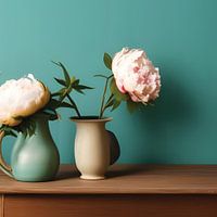 geschilderde aardewerken vazen met 2 bloeiende pioenrozen op een houten tafel, dit alles tegen een mooie blauwe houten wand is een ware eyecatcher in je interieur. Het stilleven is opgebouwd uit meerdere vazen en potjes op tafel gecreeerd met behulp van AI.