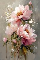 Een verfijnd schilderij van weelderige roze pioenrozen in volle bloei, omringd door delicate witte bloesems tegen een zachte, mistige achtergrond. De compositie straalt een tijdloze elegantie uit met zijn zachte kleurverloop en meesterlijke penseelstreken die de textuur van de bloemblaadjes perfect vangen. Het spel tussen licht en schaduw creëert een dromerige, romantische sfeer die de natuurlijke schoonheid van de bloemen benadrukt.