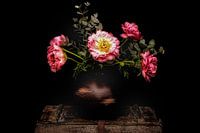Verwante termen: pioenrozen, rozen, bloemen, eucalyptus, vaas, kist, antiek, vintage, romantiek, liefde, landhuis, landhuisstijl, boerderij, boerenrozen, retro, hout, klei, natuur.