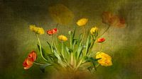 Deze gele en rode pioentulpen heb ik elk apart gefotografeerd en in de nabewerking bij elkaar gezet, zodat ze een fraai boeket vormen.