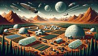 Een pas opgerichte kolonie op Mars wordt afgebeeld met koepels, kassen en zonnepanelen. Pioniers werken aan terravormingsprojecten, planten vegetatie en creëren waterbronnen. Op de achtergrond staan uitgestrekte Marsbergen, terwijl transportschepen uit de lucht neerdalen om meer kolonisten en voorraden te brengen.