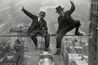 De fictieve afbeelding toont twee ingenieurs die op duizelingwekkende hoogte zitten op een bouwplaats voor wolkenkrabbers in het begin van de 20e eeuw. Hun kleding weerspiegelt de stijl van die tijd, met pakken en hoeden die een sfeer van professionaliteit en autoriteit uitstralen.