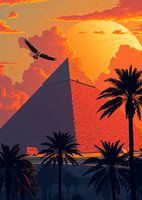 Een illustratie van de piramide van Gizeh bij zonsondergang, met het eeuwenoude bouwwerk badend in warme gouden en oranje tinten als de zon erachter ondergaat. De lucht gaat over in diep paars en blauw en werpt een serene gloed over het woestijnlandschap. De piramides steken majestueus af tegen de uitgestrekte zandvlakte, hun verweerde stenen worden verlicht door het laatste licht van de dag. De scène roept een gevoel van tijdloos mysterie op en benadrukt de grootsheid en geschiedenis van dit iconische wonder.