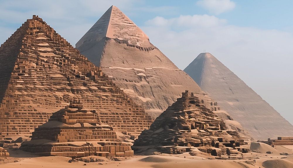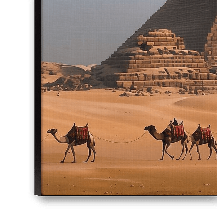 Piramides en kamelen daglicht panorama schilderij die een luxe toevoeging zal zijn aan elke ruimte. Met zijn unieke en stijlvolle uitstraling is het een ware eyecatcher. De schitterende kleuren en het bijzondere ontwerp maken dit kunstwerk 100% uniek en origineel. Het is de perfecte fotoprint om je interieur helemaal af te maken.