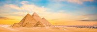 Panorama van de grote piramides van Gizeh bij zonsondergang