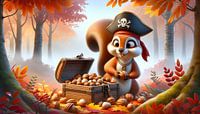 In een schilderachtige herfstscène heeft een eekhoorn, gekleed in een piratenhoed en een rode bandana, een schat ontdekt. De schat, een kist vol glimmende nootjes, staat open tegen de achtergrond van het kleurrijke herfstbos. De eekhoorn staat op zijn achterpoten en houdt een van de noten in zijn kleine pootjes, terwijl hij naar zijn vondst kijkt met glanzende ogen die spreken van trots en vreugde. De mist die tussen de bomen met hun rode en oranjekleurige bladeren hangt, geeft het tafereel een sfeer van mysterie en magie. Bladeren vallen zachtjes op de grond terwijl de eekhoorn van zijn vondst geniet. Om hem heen sieren nog meer herfstbladeren en verspreide noten de bosgrond en het zachte late namiddaglicht baadt het hele tafereel in een warme gloed. Het is een moment van triomf en oogsttijd vastgelegd in deze verrukkelijke afbeelding.
