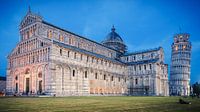Blaue Stunde über der Toskana und den weltberühmten Sehenswürdigkeiten von Pisa: Ein Blick über die Piazza dei Miracoli bzw. Piazza del Duomo auf den Dom zu Pisa und das Wahrzeichen der Stadt, den Schiefen Turm von Pisa.