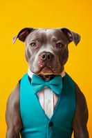 Een charismatische pitbull in een net pak en felblauw strikje straalt zelfvertrouwen uit. Zijn gespierde lichaam en vastberaden blik geven hem een fascinerende, charmante uitstraling, terwijl de felgele achtergrond de elegantie en individualiteit van deze speciale viervoeter benadrukt. Een perfecte mix van kracht en stijl!