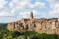 Pitigliano in Toscane, Italië. (kleur, liggend). Het indrukwekkende aanzicht bij aankomst van dit prachtige plaatsje in Toscane. Boven op een heuvel torent het boven het Italiaanse landschap uit. Het valt niet te missen!