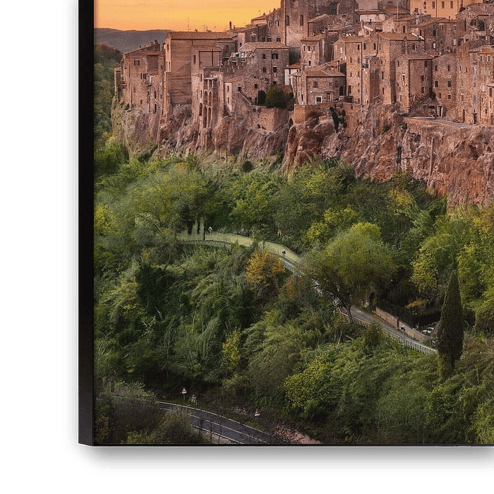 Pitigliano middeleeuws dorp op tufstenen rotsachtige heuvel. Panorama bij zonsondergang.
