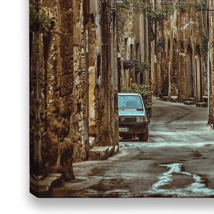 Oude smalle straat met geparkeerde Fiat in Italiaans dorp Pitigliano. Antieke lantaarnverlichting