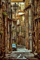 Oude smalle straat met geparkeerde Fiat in Italiaans dorp Pitigliano. Antieke lantaarnverlichting