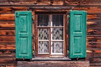 Een kleurrijke foto van een houten huis met een houten raam met groene luiken. De houtnerven en knoesten zijn duidelijk zichtbaar en vormen een prachtig patroon. Ook het zonlicht maakt een patroon op de gordijnen. De foto is genomen in een klein pitoresk dorpje in Zwitserland.