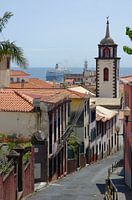 De schilderachtige, steil omhoog lopende steeg Calçada de Santa Clara in Funchal met de kerk met de Igreja de São Pedro. Op de achtergrond verlaat een cruiseschip de haven. Madeira, Portugal. Genomen in het voorjaar van 2023.