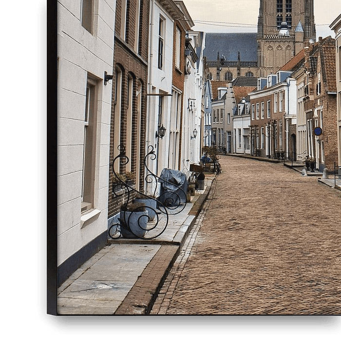 Een karakteristiek straatje in de vestingstad Zaltbommel met de Sint-Maartenskerk, deze kerk uit de 15e eeuw is een goed bewaard voorbeeld van Nederrijnse gotiek. De kerk geeft met zijn stompe toren de stad een karakteristiek aanzien.