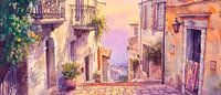 De zachte pastelkleuren van de schemering omhullen het pittoreske steegje en nodigen je uit om te dromen. Balustrades en bloeiende planten geven het beeld een romantisch tintje, terwijl de stenen paden verhalen van vervlogen tijden fluisteren. Ideaal voor de woonkamer, het creëert een gezellige sfeer en opent ramen naar de mediterrane ziel.