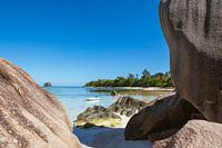 Prachtig uitzicht over Anse Union naar de enorme Union Rock op het eiland La Digue, Seychellen