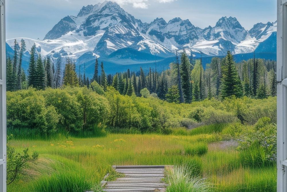 Dit adembenemende kunstwerk biedt een ongeëvenaard uitzicht op een weelderige bergweide omringd door majestueuze besneeuwde bergtoppen. Gezien door het open raam straalt het tafereel een gevoel van vrijheid en vrede uit, ideaal voor natuurliefhebbers en wandelliefhebbers. Perfect voor de woonkamer, slaapkamer of kantoor, dit landschap brengt een verfrissende en inspirerende sfeer in je huis en nodigt je uit om te dromen en te ontspannen.