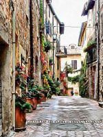 In Toscane, Italië, ligt Pienza, een grote stad vol historische gebouwen en prachtige traditionele architectuur. In de stad hebben deze terrassen van huizen en appartementen geen tuin, dus veel mensen zetten sierlijke terracotta potten met planten op de visgraat tegels bij de voordeur van hun huis of op hun balkon. Dit is een typisch pittoresk straatje in Pienza.