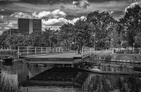 Handbediende draaibrug Prinsenhoeven aan de Piushaven in zwart wit gefotografeerd.