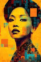 Een gezicht opgebouwd uit kleurvlakjes en patronen. Traditionele schoonheid krijgt een digitale remix vol textuur en lef.