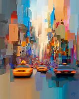 Dit kunstwerk vangt de energie en dynamiek van een typische straat in New York City, met iconische gele taxi's die door de stad razen. De gebouwen aan weerszijden zijn abstract en opgebouwd uit kleurrijke, pixelachtige vlakken in tinten van blauw, oranje, roze en beige, die een gevoel van beweging en vervaging geven. Dit spel van…