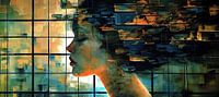 Pixelated Tranquility - Dit vrouwen schilderij toont een abstracte representatie van een vrouwelijk profiel, opgebouwd uit een collage van fragmentarische, ogenschijnlijk zwevende penseelstreken en kleurvlakken. De compositie is rijkelijk voorzien van blauwe, groene, oranje en bruine tinten die naadloos in elkaar overgaan en creëren een sfeer van melancholie en contemplatie. De vrouw's profiel, centraal in het werk, is prominent aanwezig en bestaat uit overlappende, semi-transparante lagen, waardoor een gevoel van diepte ontstaat. Haar gesloten ogen en de zachte curve van haar lippen suggereren sereniteit. De achtergrond en de features van het gezicht lijken opgebouwd uit losse, geometrisch gesneden panelen, wat een digitaal of pixelachtig effect toevoegt aan het gevoel dat het schilderij uitstraalt. Dit vormt een boeiend contrast met de traditionele portretkunst en wijst op een moderne, digitale invloed in de creatie.