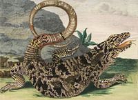 In Suriname gebruikte Merian haar artistieke en observationele vaardigheden ook om wezens zoals dit reptiel vast te leggen. Ze portretteerde zijn kenmerkende, ingewikkelde patronen van schubben met dezelfde precisie die ze toepaste op insecten. De dynamische, elegante lus van zijn staart voegt compositorisch belang en een barokke zwier toe.
