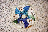 Plafond detail van kleurrijke gebroken keramische tegel scherven mozaïek ontworpen door Antoni Gaudi in de Zuilenhal, Park Guell, Barcelona, Catalonië, Spanje, Europa.