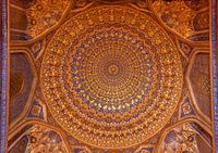 Gekleurd en gouden plafond van de Madrassa Tillya-Kori in Samarkand in Oezbekistan.
