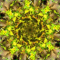 Een draaikolk van gele, groene en lichtbruine vormen, gebaseerd op een foto van de bladeren en vruchten van een plataan in de lenteregen.