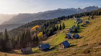 Een verzameling huisjes boven op de Planina Zajamniki in Slovenië. Prachtig uitzicht in mooie herfstkleuren.