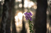 Close up van vingerhoedskruid dat in het bos groeit, met prachtig gouden zonlicht op de achtergrond.